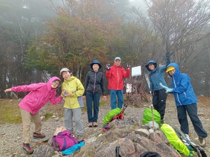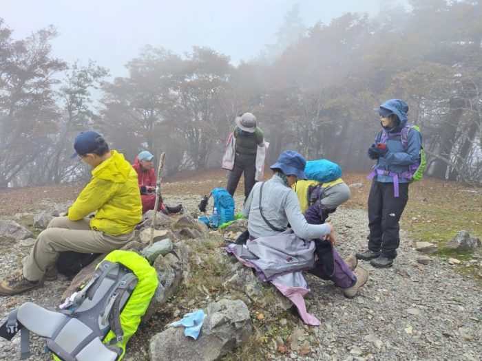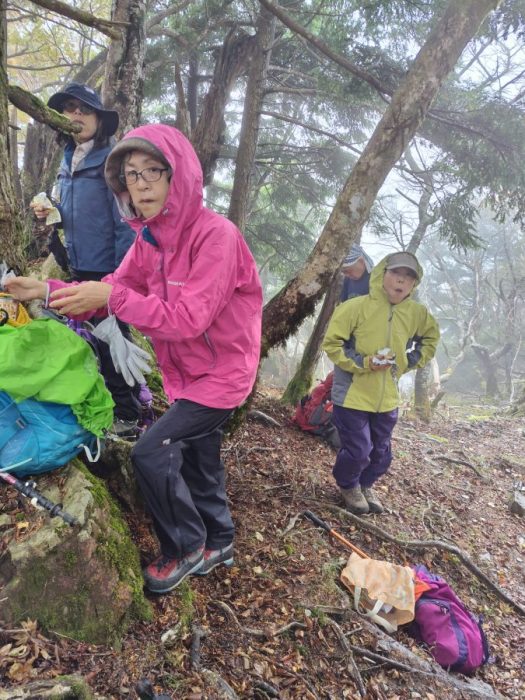 途中で雨具を着た。頂上までもう少しだけど、ザック開けたのでせわしない立ちランチになってしまった。以前行った天城山の5分間で食べたランチよりはまだいいか!