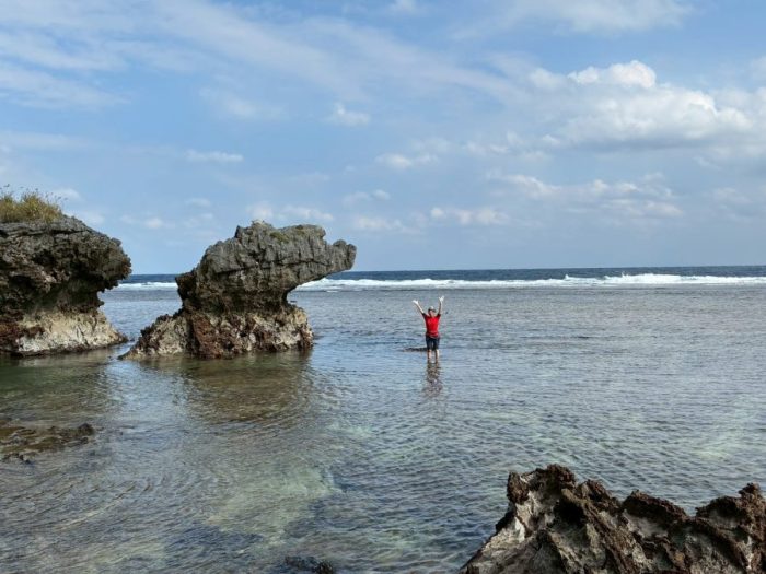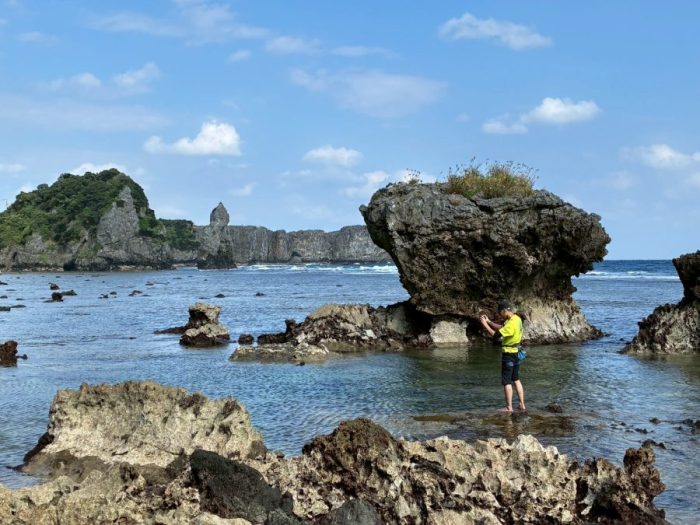 と、ここで磯遊びタイム。11月の沖縄は遊泳できる季節ではありませんがせっかく沖縄へ来たのだからせめて足くらいは浸かりたいもの。クライミングシューズをウォーターシューズに履き替え海の中へ。