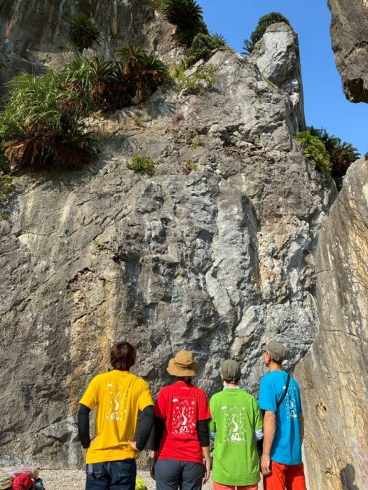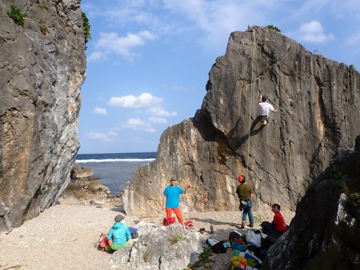 お昼休憩の後、干潮になりアンダギー岩から歩いて2分ほどのアクアリウムウォールエリアへ移動。全部で10本ほどのこぢんまりとしたエリアですが5.7~5.10aが5本あり初心者に嬉しい。