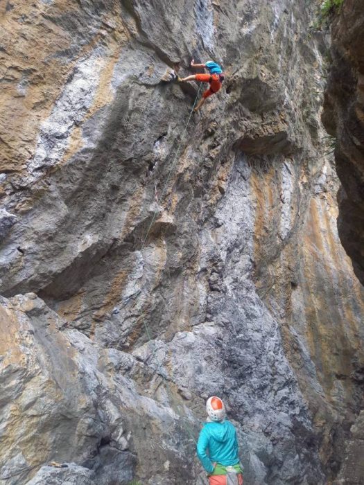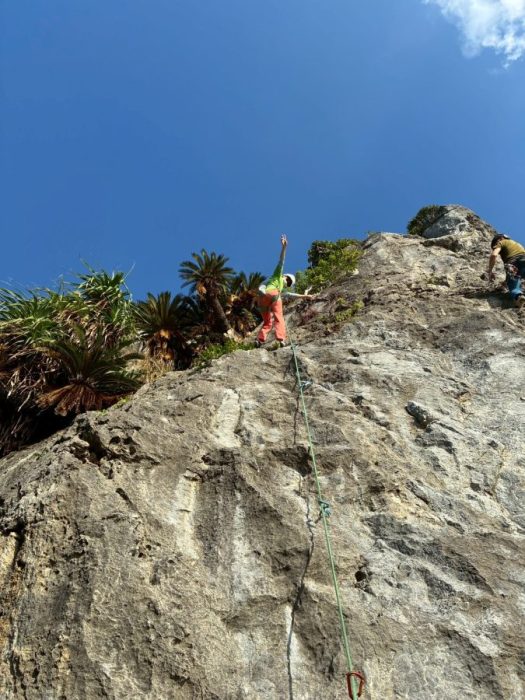 その後、私もトップロープにして触らせてもらいました。出だしは被っていますがガバがたくさんあり快適です。が、その後の中間地点の薄く被ったクラックが解決できず。粘ってみたものの諦めてA0で少し上がりました。その後もなんどもテンションしながらトップアウト。強傾斜あり、繊細なクラックあり、最後はバランシーで変化に富んでいてこの壁の代表的なルートだというのも納得です。いつかまたトライしてみたいです。