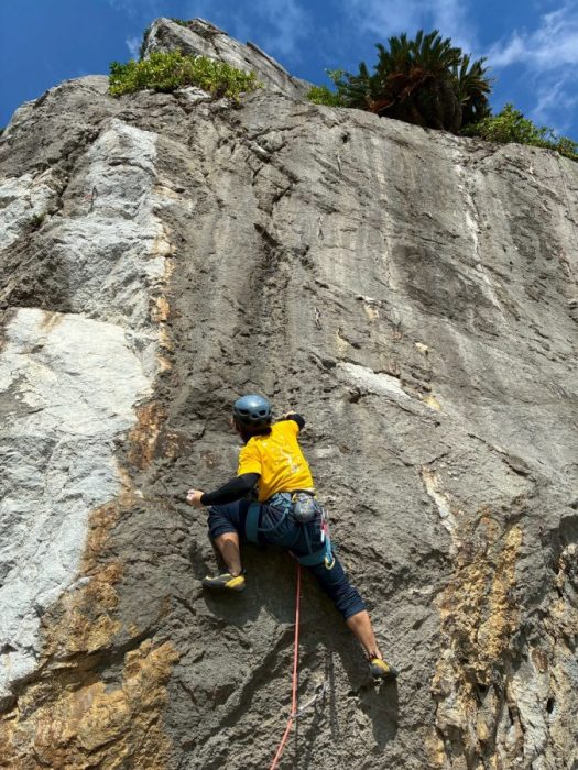 ↑荷物を置いてあるアンダギー岩周辺に戻るとヤマトさんがイレブンのトップロープ課題をトライ中。