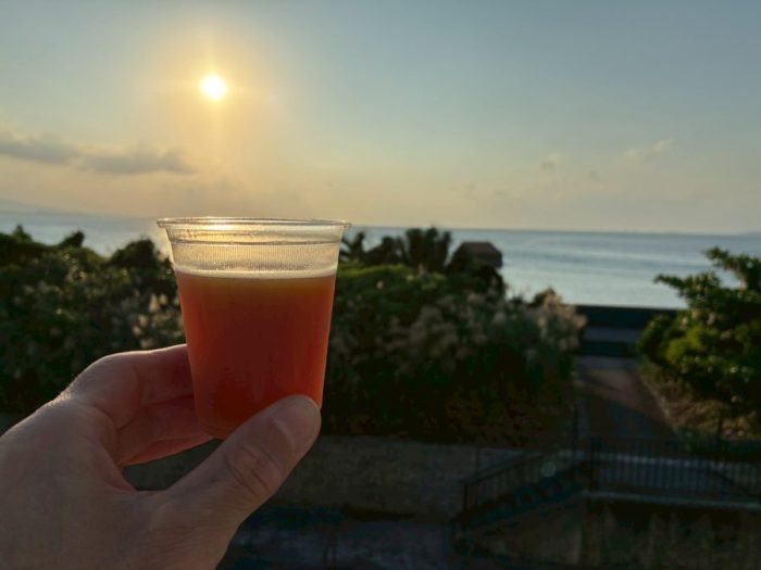 テラスに上がって夕日をバックに飲むビールは最高!個性的で濃厚な味わいです。
