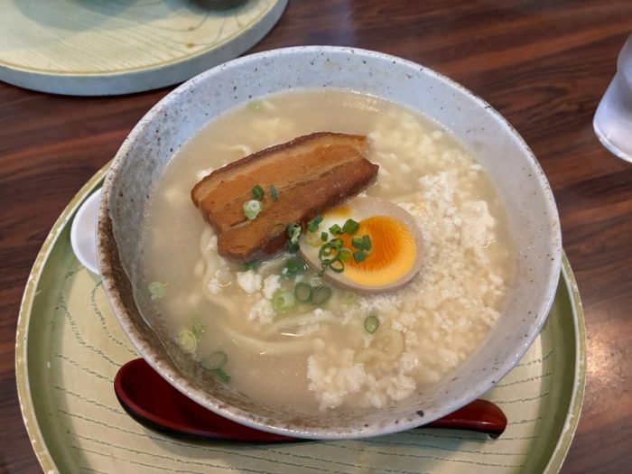 順調なフライトでお昼すぎには目的地の那覇空港に到着。レンタカーを借り、お腹も空いてきたので市内のゆし豆腐そば専門店へ向かいます。