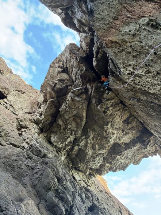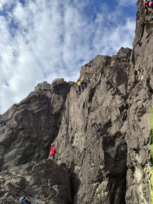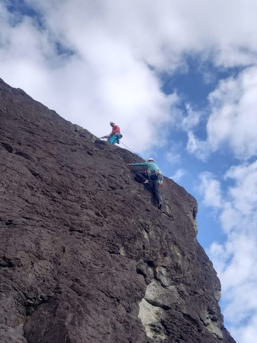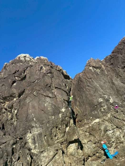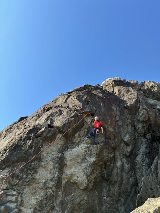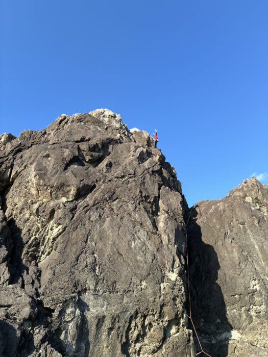 ビレイをするQさん、ドーム内からイデッチ、岩の上から私、3方向から見守るなか無事RPです。