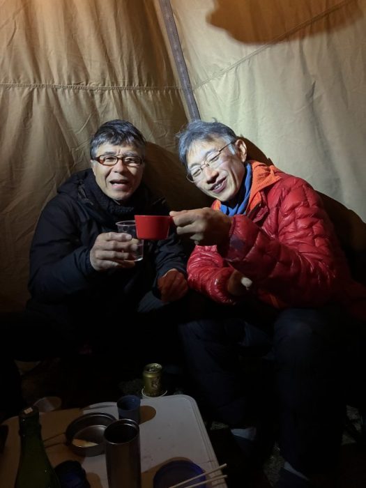 さて、この日は私達のテントにスペシャルゲストが訪れました。11月の静岡労山60周年記念事業で講演をしてくださった成瀬さんが徳島を訪れているということでテントサイトに遊びにきてくれたのです。講演会では話しきれなかった沢の話やグレートアースの話などいろいろ話をして盛り上がりました。始めは「少しだけ」と言っていたはずが、気づけば日本酒を三本空け夜は更けていくのでした。