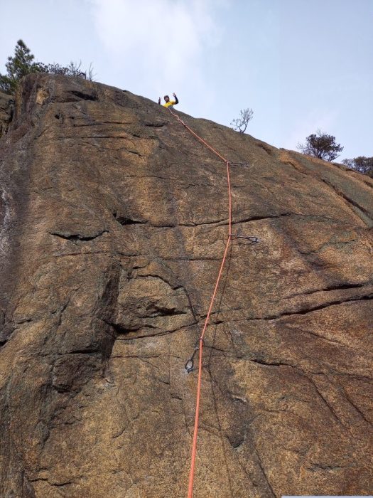 最後にイデッチが「雷火」に取りつきトップアウト、先ほどの「パラグラフ」で〆たはずですが、せっかくなのでトップロープにしてもらい私も登ることにしました。お買い得とはいえイレブンのルートは私には難しく何度もテンションしながらトップアウトしました。細かいカチで保持しながら身体を持ち上げていくような動きはこれからの課題になっていくのだと思います。とはいえトップロープで快適に登らせてもらい今度こそ、この旅最後のクライミングとなりました。