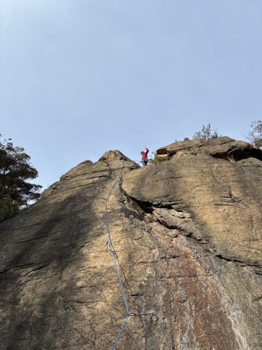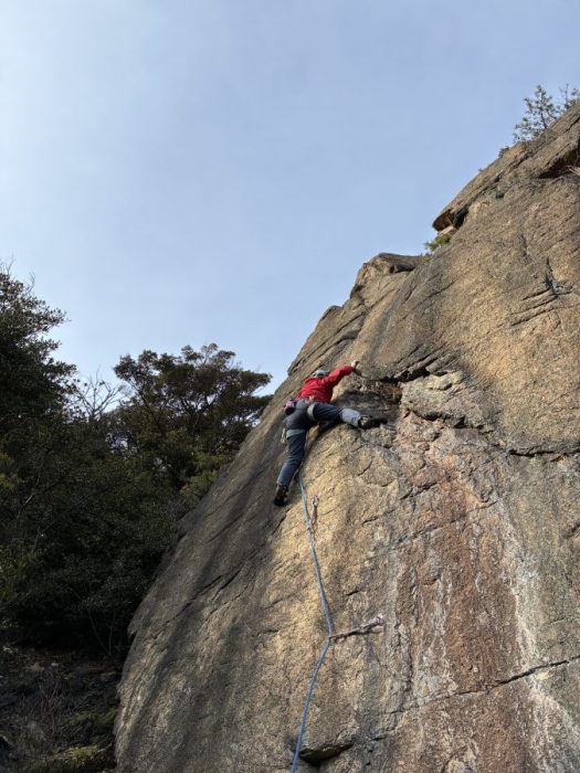 続いて私も挑戦してみます。先ほど下からみていた通り細かいカチやスタンスが続きますが、耐えていると必ず次のホールドが見つかります。バランスを崩さないように粘って粘ってなんとか核心を越えることができました。
